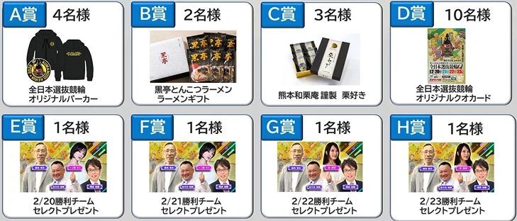 「全日本選抜2月20日(金)~2月23日(日・祝)」の開催期間中、対象開催を合計10,000円以上購入すると、抽選で以下の豪華賞品をプレゼントいたします!